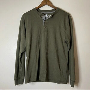 • features men’s long sleeve dark green forest green colored tee, three button up neckline with gray fabric underneath. Cotton blend casual shirt. Durable and soft.