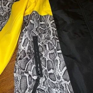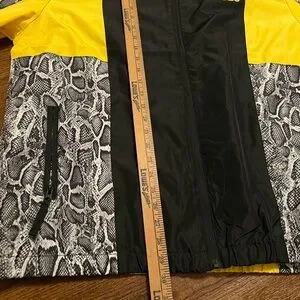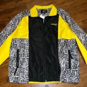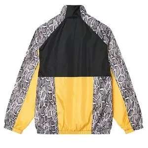 Wesc black and yellow colorblock track jacket windbreaker features a stand collar, side zip pockets, and elasticized bands at the cuff and hem. Enhanced with snake-printed panels, the lightweight design offers a bold look.