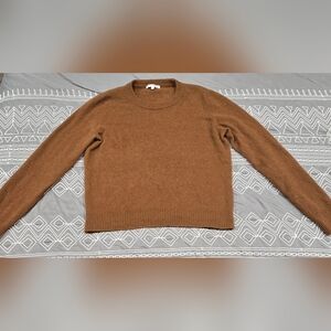Good condition. Size large. Runs small. Very soft. Cashmere. Brown in color. Ribbed on hem, cuffs and neckline. Good stretch. Measurements and fabric content listed above in pictures.