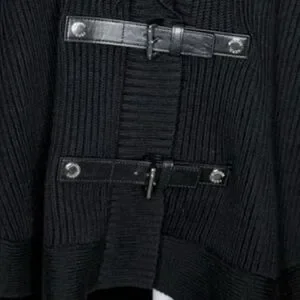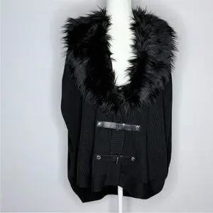 Oversized black sweater knit shrug poncho vest with removable detachable faux fur collar with buttons. It closes with a zipper and buckles with a short black belt over the zipper.