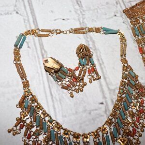 🌟 Vintage Gold, Coral & Turquoise Jewelry Set Necklace • Bracelet • Clip-On Earrings • Bold Statement