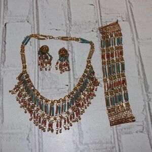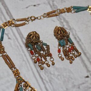 🌟 Vintage Gold, Coral & Turquoise Jewelry Set Necklace • Bracelet • Clip-On