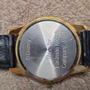 Elegant Rare Kodak watch with a gold case. Black leather strap with embossed design. Perfect for any occasion. The back states it was made for Eastman Kodak Company 1997. The watch face has the plastic on it but the watch does need a battery.