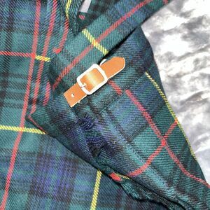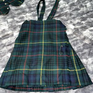 This is a vintage 2-piece Westaway & Westaway kids uniform made of 100% wool in a green plaid pattern. The set includes a skirt and vest, both in size 24. It has a school and preppy theme, perfect for girls. The uniform is of British origin and has a classic style.