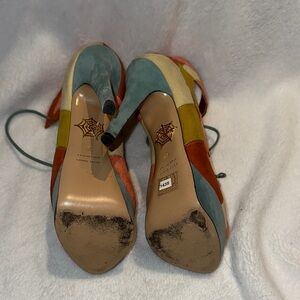 Vibrant lace-up heels with a playful pattern. Perfect for adding flair to any outfit. Suede and chrystal details