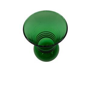This vintage Anchor Hocking vase is crafted from green glass and features a mid-century style. It stands approximately 6 inches tall and 3 inches wide, with a distinctive ball bottom, flared top, and ringed neck. Originating from the mid-20th century, this piece is a classic example of mid-century design. It is pre-owned but in great condition with no chips.