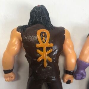 A unique set of vintage WWF wrestling action figures. This bundle includes figures of The Undertaker, Mankind, and Paul Bearer, all capturing their distinct appearances from the era. Notable details include Mankind's mask, The Undertaker's signature attire, and the manager's classic suit. Ideal for collectors of wrestling memorabilia or fans looking to recapture the nostalgia of classic WWF matches, these figures would be perfect for display in a collection, as a gift for a wrestling enthusiast, or as unique decorations for a themed event.