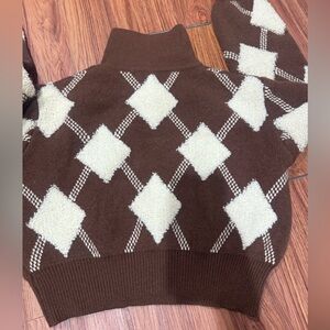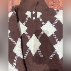 Stay cozy and stylish with this brown and cream argyle sweater. Perfect for any casual outing.