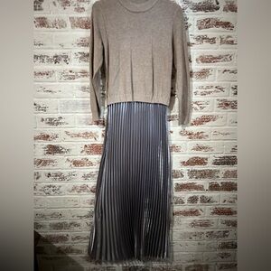 Bottom Section: The lower portion is a long, metallic maxi skirt with accordion pleats, which are uniform folds formed by doubling fabric back upon itself. The top is more of a beige-taupe and the bottom is more like a silver-taupe. This is unbranded and I ordered in a medium, but it could also fit as a small to medium. It is long and still brand new. It has never been worn.