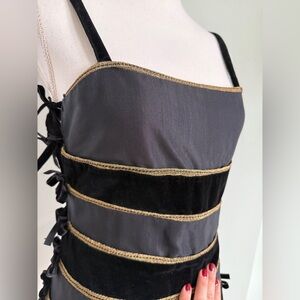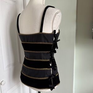 An 80s Gianni Versace gold and black velvet corset with bows is an iconic, luxurious vintage piece that embodies Versace's opulent style, rich fabrics, baroque patterns, gold accents reflecting the era's maximalism and celebrity focus!