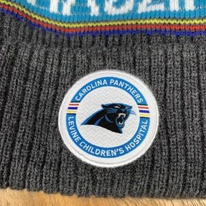 Team/Design: Features "CAROLINA" wordmark around the crown, round "Carolina Panthers Levine Children's Hospital" patch on the cuff, and small three-figure multicolor charity tag on the side.