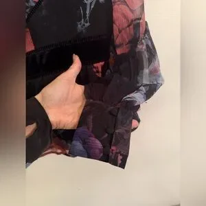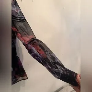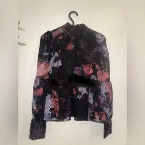 Chic sheer blouse with vibrant floral patterns. Features long sleeves and elegant design.