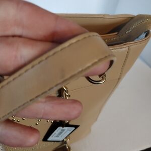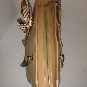 Stylish tan tote bag by bebe. Features chain straps and decorative bow. Includes matching pouch. Callouts: A few black marks on handles; may be able to be cleaned (see photos). Retail $109 | NWT
