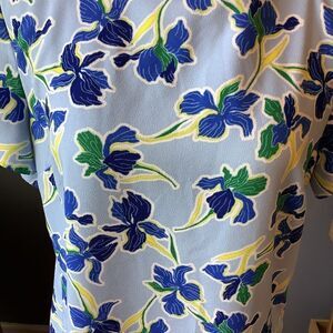 Gorgeous blue, lemon yellow and green floral print dress. Cute tied open shoulder detail. This dress slips on and makes summer dressing easy! Size medium.