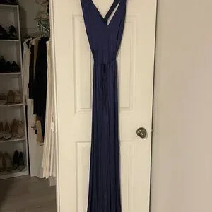 Flowy fabric. Satin. Long design. Straight design. V-neck. Crossover straps on the back. Decorative bow. Party and events collection.