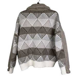 BLANKNYC Sherpa Button Front Jacket in Comfort Queen, a taupe beige grey shade with cream detail. Solid colored front, knit back and sleeve detail with an argyle diamond print. This Blank Nyc Faux Shearling Shacket or teddy coat features a relaxed, oversized fit, front patch pockets with diamond print, faux suede trim, and ribbed cuffs and hem. Front snap button closure, long sleeves, collared, lined. Perfect to layer for a warm, cozy, comfy yet neutral look all fall long. Excellent used condition. Women's size XS extra small, oversized fit, measurements pictured. Originally sold at Revolve, style #01JP6005RV
