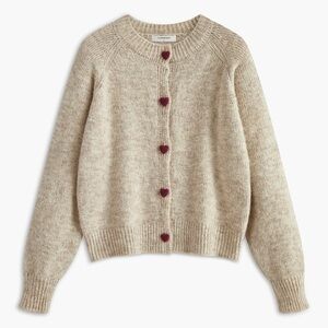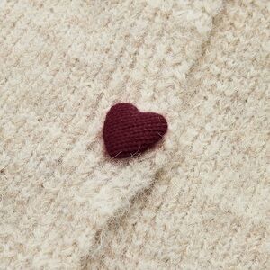 Chic beige cardigan with red heart-shaped buttons. Soft knit fabric. Ideal for layering.