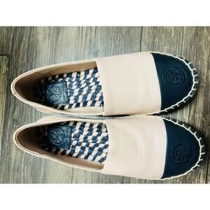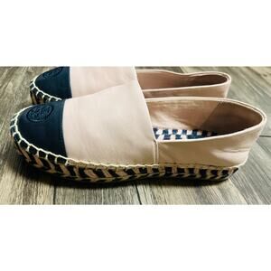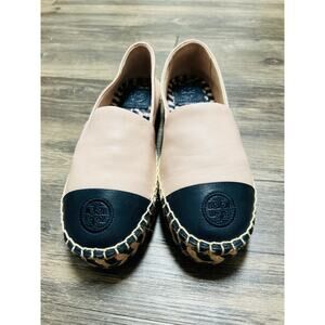 Brand new without box — Tory Burch leather cap-toe espadrilles in a soft blush pink with contrasting black logo cap toe. Finished with a woven jute midsole and signature patterned trim for a polished designer touch. A perfect mix of preppy, quiet luxury, coastal chic, cottagecore, and normcore summer style. Lightweight, comfortable, and easy to style with denim, sundresses, or resort looks. Women’s size 6. Never worn.