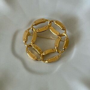 Vintage gold-tone brooch featuring an elegant circular openwork design, resembling interlocking links. This classic and versatile piece measures just under 2” in diameter and is in excellent condition. A timeless accessory that adds a touch of sophistication to any outfit, perfect for vintage jewelry collectors or as a thoughtful gift.
