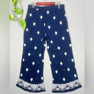 Navy blue tassel drawstring pants with white embroidery