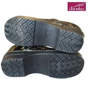 Elevate your casual or workwear wardrobe with these Dansko Professional Clogs Shoes in size 40. The green patent leather upper material is accented with an animal print pattern, adding a touch of style to your outfit. The round toe shape and slip-on closure make them easy to wear, while the mid-height heel provides comfort for all-day wear.