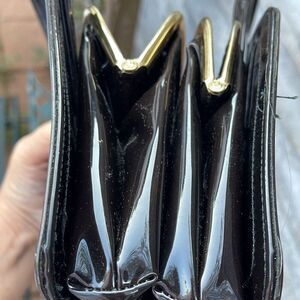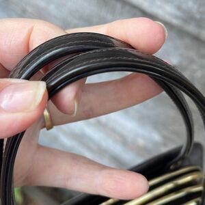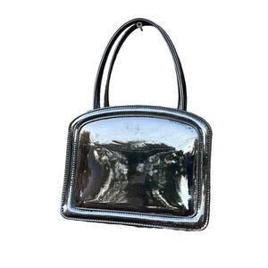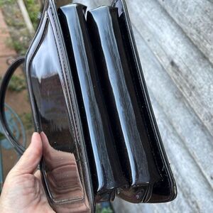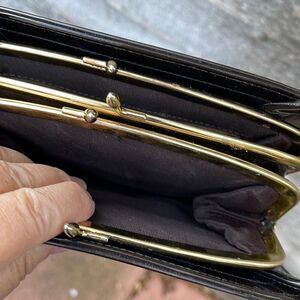 Vintage double sided kiss lock marbled faux leather bag. Two separate sections. One has a side wall zippered pocket. Double handles. Hard to show color but it is a marbled black to dark brown. Slight scratches on surface. Lightly worn. Handle drop 4 “. 6.5” high x 8” Wide and 3” deep. Very unique cool girl
