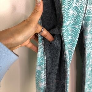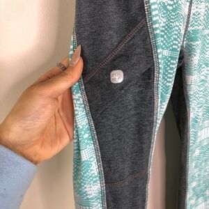 Beautiful and super comfy SOYBU turquoise white pattern leggings with grey stripes down sides to elongate your legs! Pocket on side to keep your chapstick or keys!