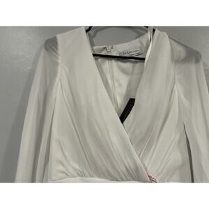 On sale is a Mac Duggal 26655 White Long Blouson Sleeve Ruched Mini Dress Sz 4. It is new with tags.