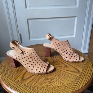 Chic tan heels with perforated design. Slingback style w/ adjustable velcro closure. Chunky Block Heel .