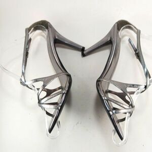 Almond open toe. Strappy Buckle closure; ankle strap. Lightly cushioned Metallic Stiletto heel
