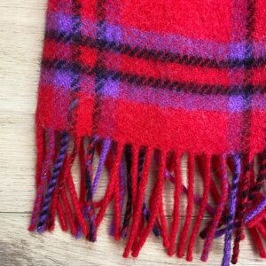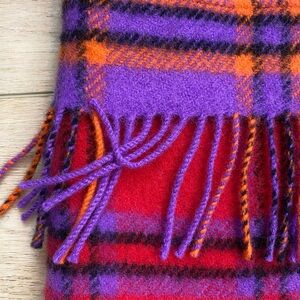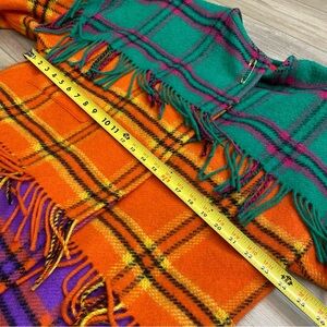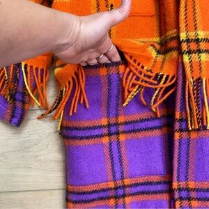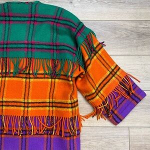 Absolutely stunning and unique Vintage designer art jacket Wool overcoat by Ko and Co Jean Charles De Castelbajac made in France. I believe this is a one of a kind studio piece. Constructed from thick brightly colored plaid and layered in contrasting Green, Orange, purple and red all with statement fringe trim.