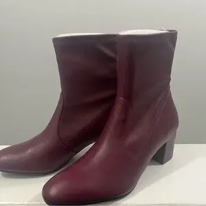 Chic burgundy slip-on boots with a sleek design. Perfect for elevating any outfit. Never worn. Fits narrow yet comfortable. If you wear a size 8, this boot will fit well or if narrow boot is fine for a shoe size 8:5. Does not come with box. Comes in clear shoe container. Has original shoe bag as pictured.