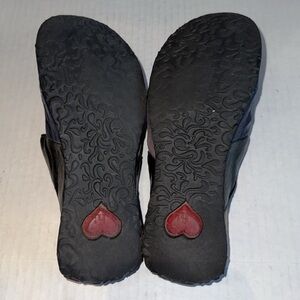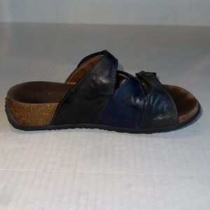 Think! Tri color leather slide sandals. Cork with a non slip sole. Velcro adjustable strap closures. Size 38 = US 7 1/2. Heel and ball of sole shows some wear, otherwise, good pre owned condition