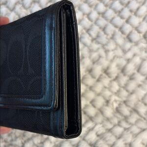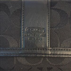 A timeless, hard-to-find vintage COACH Leatherware wallet featuring the classic black signature “C” jacquard and smooth black leather trim. This elegant trifold-style wallet is unused and comes with its original Coach box—making it a perfect gift or collectible piece for Coach lovers.