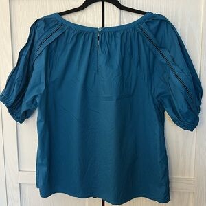 Keywords: Loft blouse, teal blouse, blue top, puff sleeve blouse, pleated blouse, casual top, women's blouse, size M, cute blouse, dressy casual, ladder stitch, short sleeve blouse