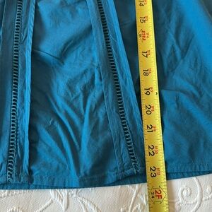 Stylish teal blue blouse from Loft, perfect for adding a pop of color to your wardrobe. This top features a unique pleated design down the front, complemented by delicate ladder stitch detailing. The puff sleeves add a touch of elegance, while the lightweight fabric ensures comfort. A versatile piece that can be dressed up or down, this blouse is ideal for brunch with friends or a casual day at the office.