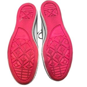 Experience timeless style with these Converse sneakers, featuring a gray canvas upper with pink accents and white rubber sole. The iconic low-top design ensures comfort and versatility for any casual occasion. With their durable construction, these sneakers are a staple for everyday wear. Very clean.