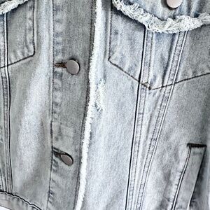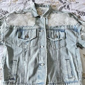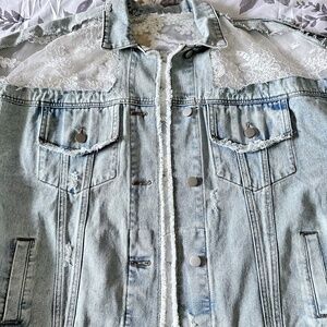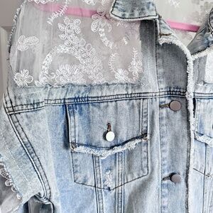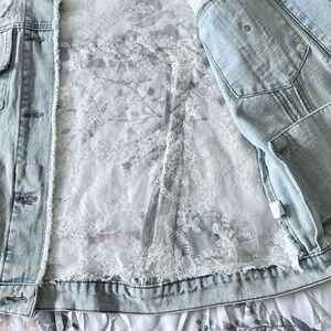 Own this one of a kind denim jacket with distressed and lace details. Never worn, excellent condition.