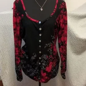 Stylish button-down shirt with vibrant floral pattern. Features a scoop neckline and long sleeves. Ideal for casual or dressy occasions.