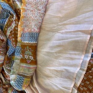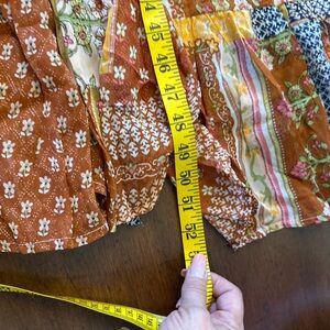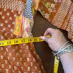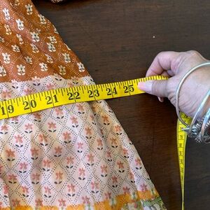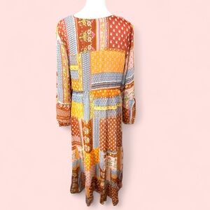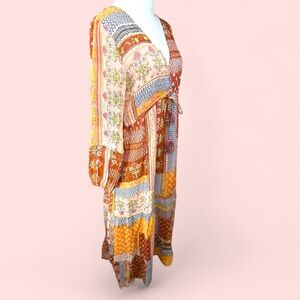 This stunning sundress by RAGA showcases a vibrant blend of orange ,brown and pink, patchwork florals , ideal for casual or resort wear. Featuring a flattering V-neckline and 3/4 bishop sleeves, it offers a relaxed and flowing silhouette. The intricate patchwork design with geometric and ornamental patterns adds a touch of bohemian charm.