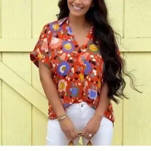CABI #5892 Visionary Replay Womens Orange Floral V-neck Shirt Size Small