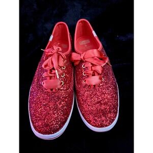 These are the Keds x Kate Spade New York Champion Glitter sneakers. They are a collaboration product featuring a glitter-coated canvas upper, soft breathable lining, a cushioned footbed, flexible rubber outsole, gold-tone eyelets, and satin ribbon laces. They were part of the "Celebrations by Keds" collection. NWOT