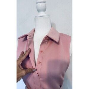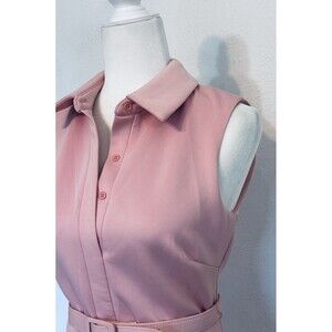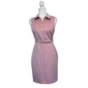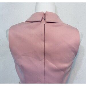 This stunning Badgley Mischka dress in a beautiful peony color is perfect for any formal occasion. The sleeveless sheath style features a collared neckline and a slimming silhouette with a belted waist.
