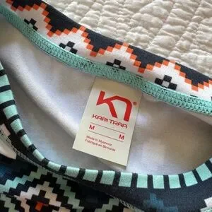 Vibrant top with intricate patterns. Features a mix of black, orange, and teal. Great base layer! I wore this two times. Just a little big me.