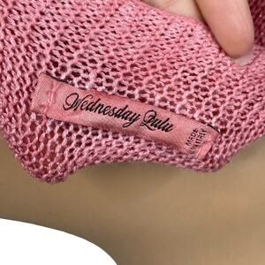 This sweater was made in Italy by the brand Wednesday Lulu. It is a pull on style with wide boat neck, dolman long sleeves and handprinted/hand dyed details. Fabric is a modal/acrylic blend knit, colors are pinks and reds. There is a small split in the right side seam (1 inch, could fix). Minimal wear, sweater is in otherwise great condition! So pretty in person!