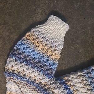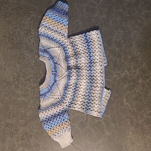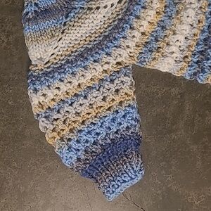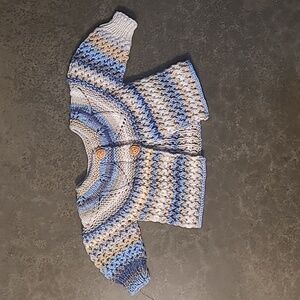 Cute Handmade Knit Baby Cardigan. Beautiful flower petal knit design around the neck. Heart shaped wood buttons. Dark blue, light blue, tan, gray, and white. Size 0-3 Months . More measurements are listed below. In great condition inside and out.