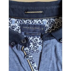 The Denim And Flower Blue Polo is a stylish and modern men's shirt featuring a collared neckline, short sleeves, and a button closure. Made from denim fabric, this polo is perfect for the warmer seasons and can be machine washed for easy care. The slim fit and size large 42 make it a comfortable yet fashionable choice for everyday wear. The addition of a pocket quarter button adds a unique touch to this classic polo, ideal for summer, fall, and spring outings or even a casual round of golf.