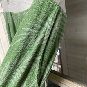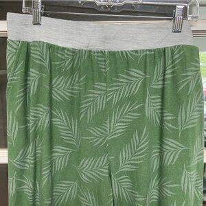 Bust measures approx 23 inches from pit to pit and the length of the top is approx 26 inches. Print on the pants is a palm leaf motif. Solid gray waistband.
