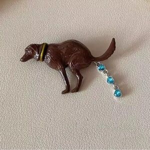 Elegant brown dog brooch with blue heart charms. Gold collar detail. Ideal for dog lovers.