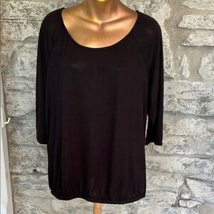This classic black women's knit top is perfect for any occasion. Its sleek design offers both comfort and style. Elastic waist and 3/4 sleeves. Light weight knit fabric. Excellent condition and never put in dryer.